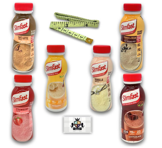 6 Ready-To-Drink Slim Fast Shakes Weightloss Bundle with Tape Measure - Chocolate, Strawberry, Vanilla, Banana, Cookies & Cream, Café Latte
