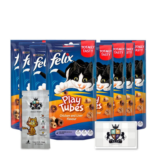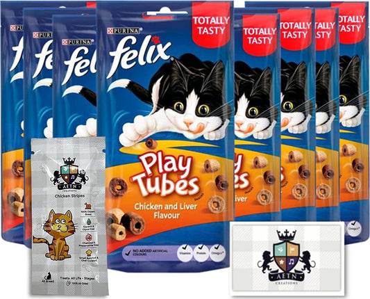 AETN Creations Felix Play Tubes Cat Treat Bundle Pack 8x50g Pouches Chicken and Liver Flavour plus AETN Chicken Stripes Treat Tasty Delicious Snack
