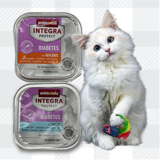 AETN Creations Animonda Integra Protect Diabetes for Cats 2 Pack 2x6x100g Poultry and Salmon plus AETN Cat Treat and Toy Tailored Diabetic Support for Cats