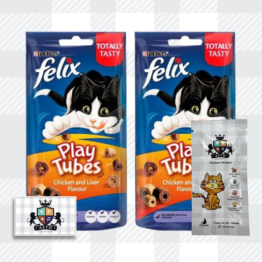 AETN Creations Felix Play Tubes Cat Treat Bundle Pack 2x50g Pouches Chicken and Liver Flavour plus AETN Chicken Stripes Treat Tasty Delicious Snack