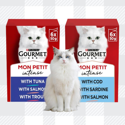 AETN Creations Delicious Gourmet Mon Petit Fish 6x50g and Ocean Selection 6x50g Premium, Balanced and Complete Adult Wet Cat Food with AETN Cat Treat and Toy