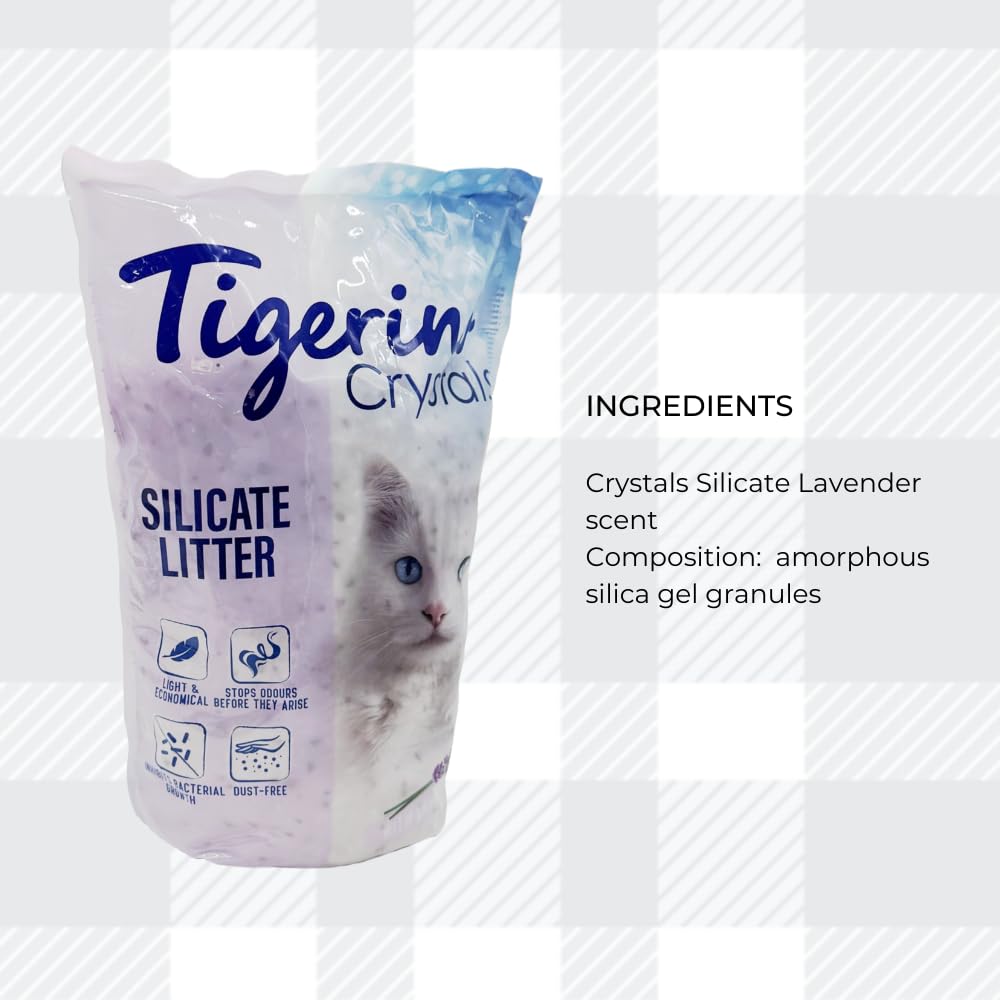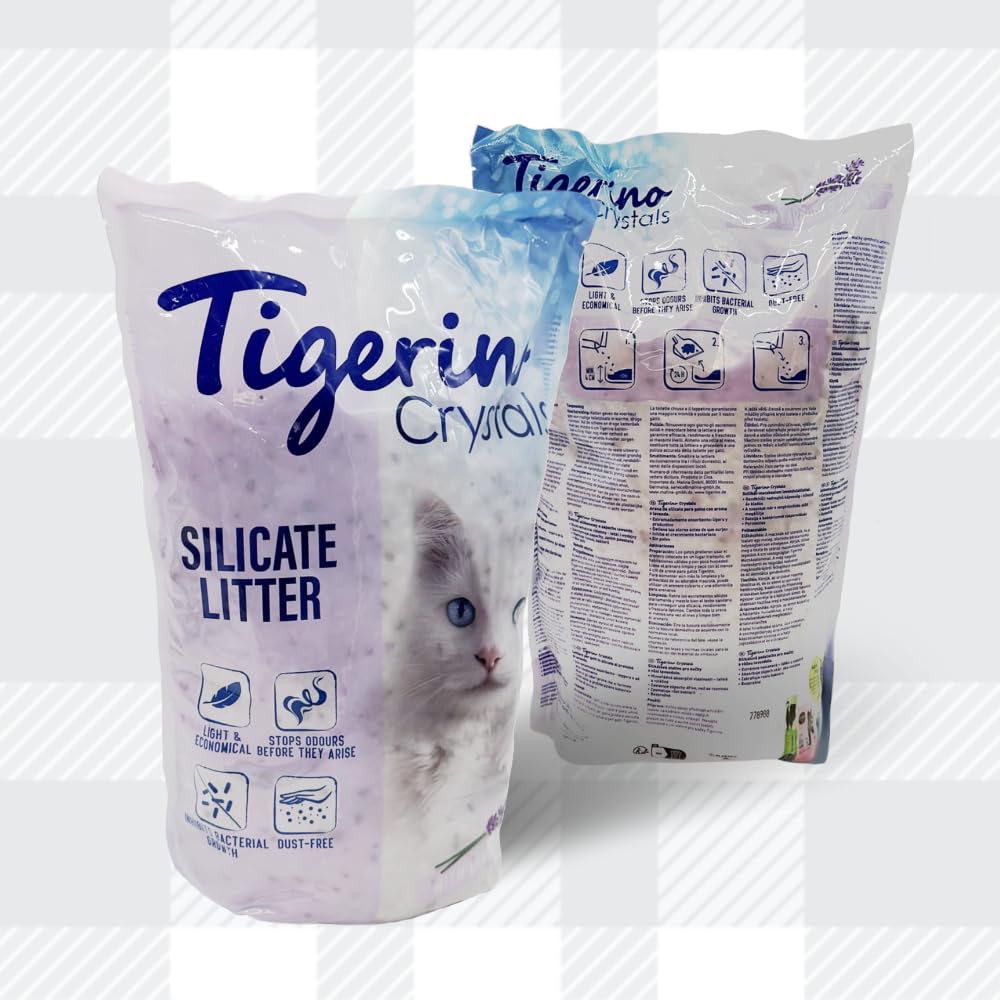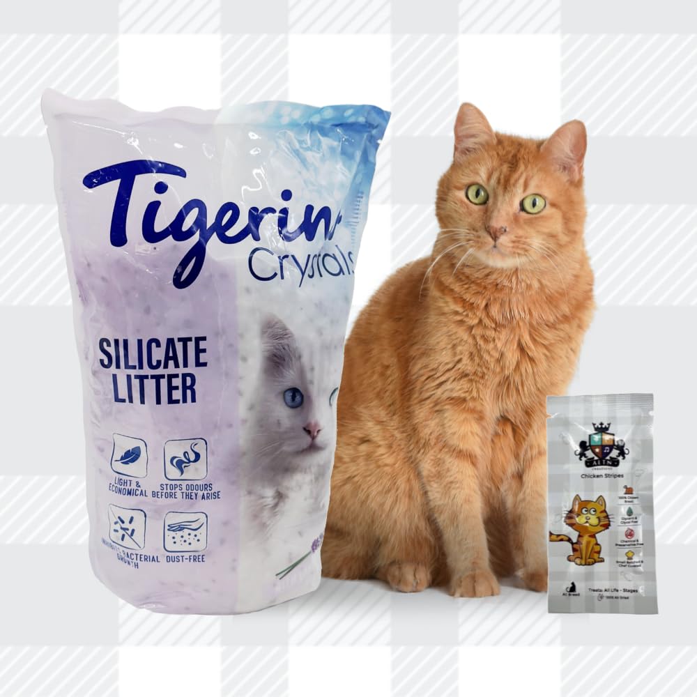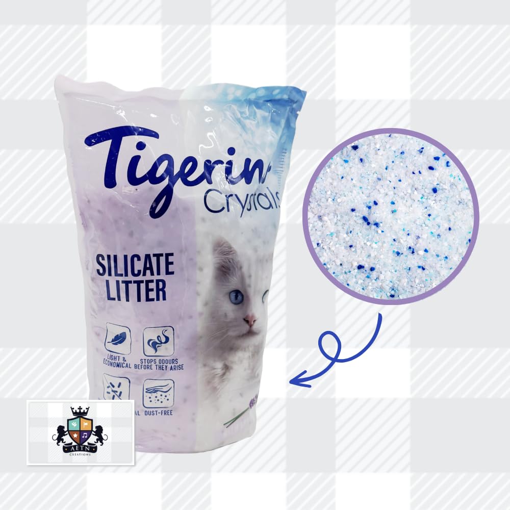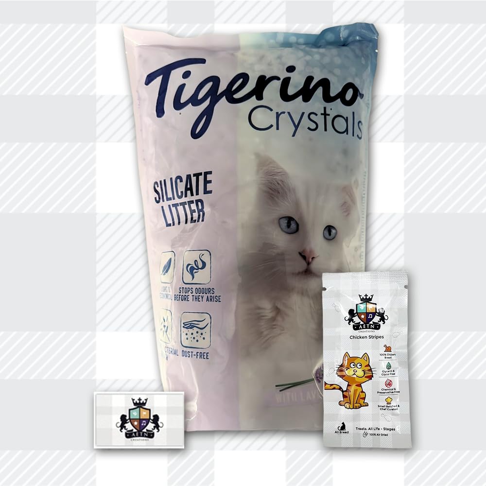 Discover the perfect harmony of freshness and convenience with Tigerino Crystals Cat Litter - Lavender Bundle. Pack includes 5L cat litter in lavender scent, crafted to elevate your cat's litter box experience while ensuring your home remains inviting and odor-free, this premium cat litter offers a bouquet of benefits that every cat owner desires. Unlike traditional clumping litters, Tigerino Crystals Cat Litter doesn't form hard clumps, the non-clumping formula means you can easily scoop out soiled crystals, minimizing waste and making litter box maintenance a breeze. Each grain of Tigerino cat litter has countless micro-pores that quickly suck up moisture, helping to keep your cat's litter box dry and fresh for longer. In addition to this cat litter, our pack also includes AETN Creations Cat Treat (sample sized) made with 100% natural, high-quality ingredients, our chicken cat treats are a healthy and delicious snack and a tasty reward that complements your cat's diet. Experience the transformative power of a litter that not only controls odours but also enhances your living space with a calming lavender aroma. Order now and choose the ultimate in convenience and freshness for you and your feline companion! Check out for other cat litter such as catsan clumping cat litter, sanicat clumping cat litter, ever clean cat litter, felight cat litter, cat litter freshener powder, cat litter wooden pellets, paper cat litter, wood cat litter and many more...This bundle pack also comes with authentic AETN Creations fridge magnet and Chicken Cat treat sample sized.