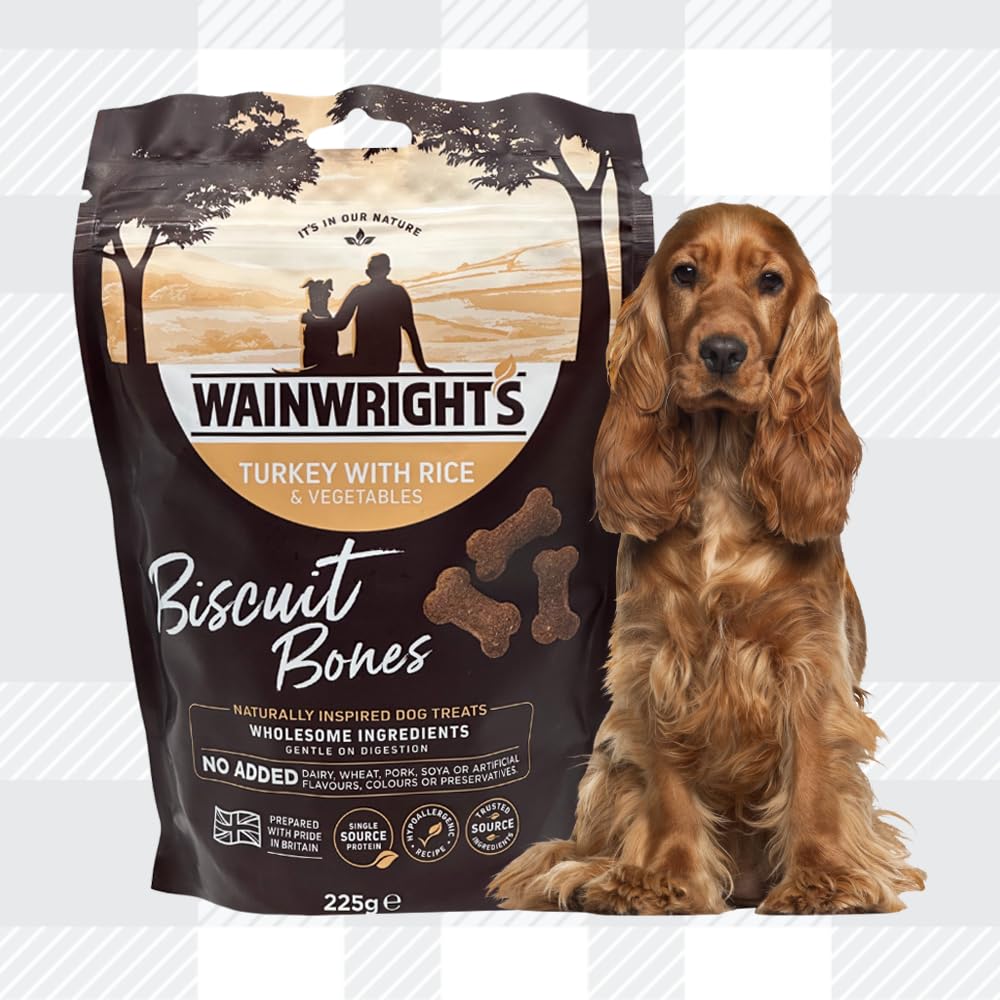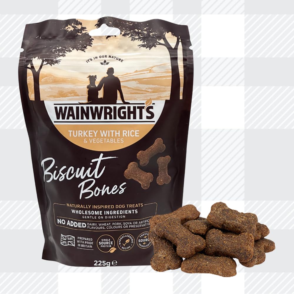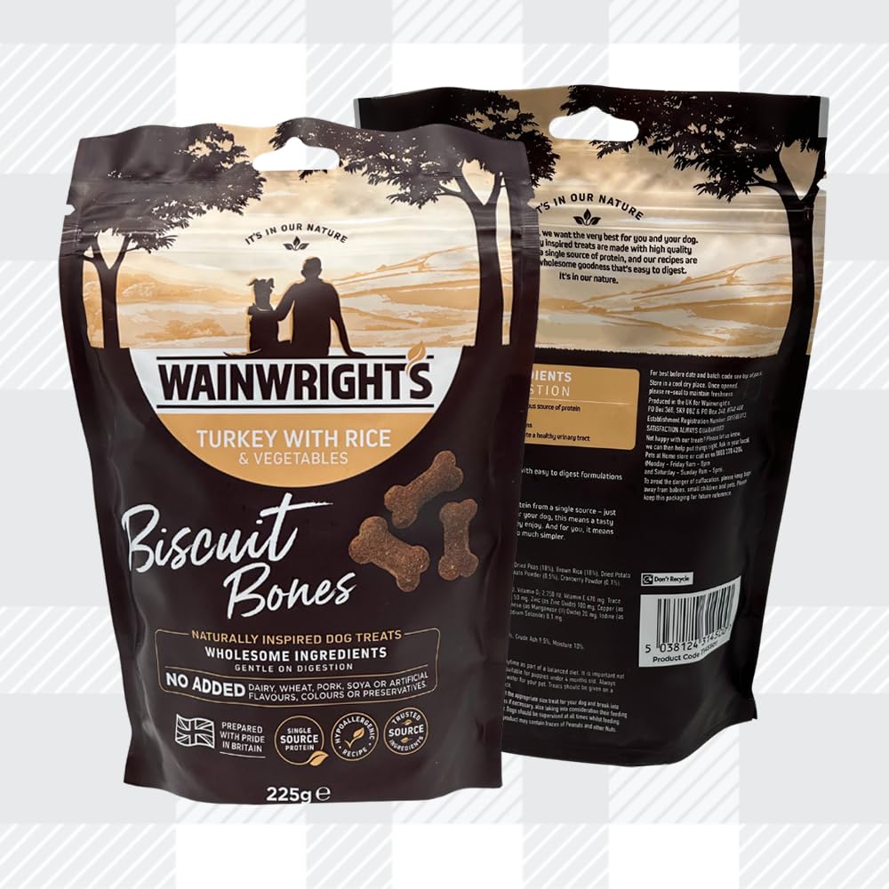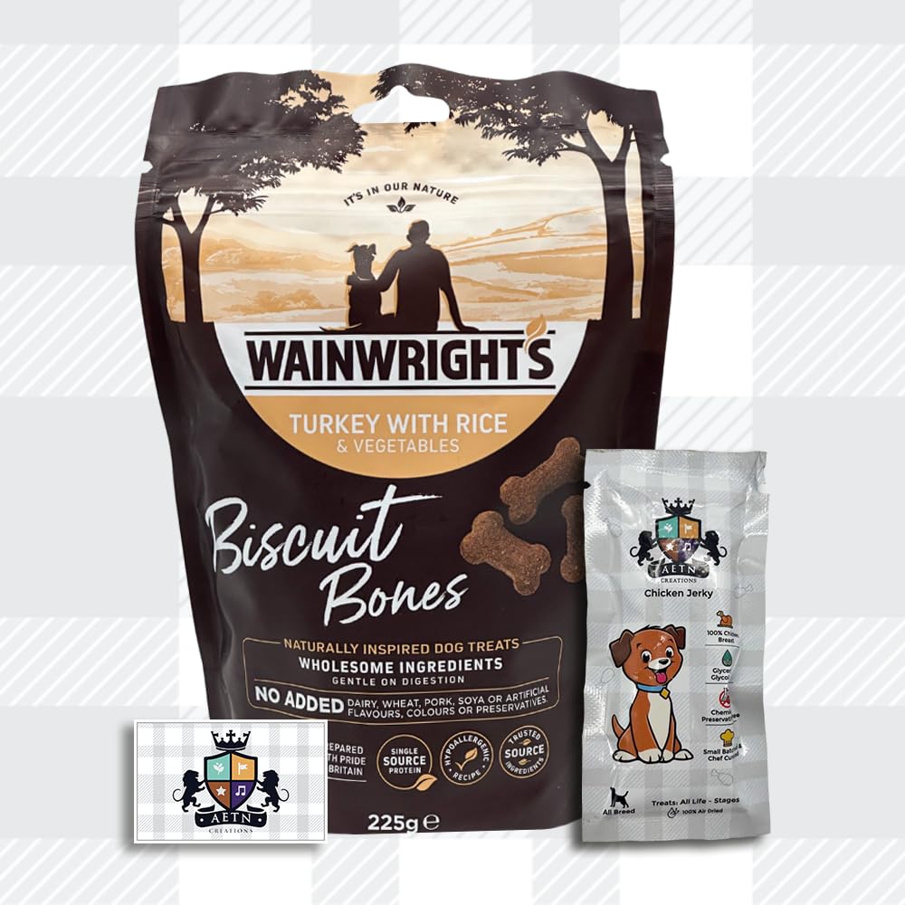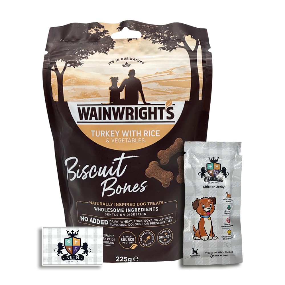 AETN Creations Wainwright's Turkey with Rice Biscuit Bones Dog Treats 225g Hypoallergenic Recipe for Adult Dogs with AETN Jerky Treat