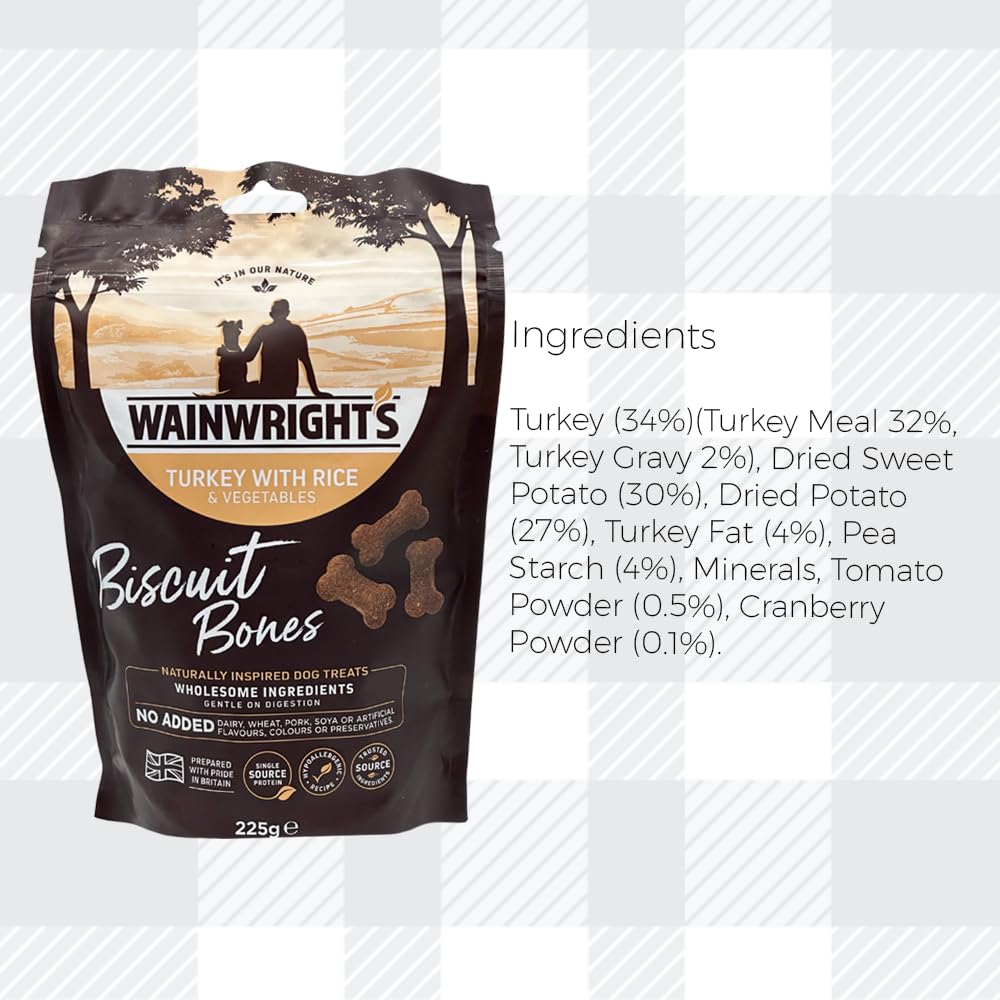 Introducing Wainwright's Turkey with Rice Biscuit Bones Dog Treats - the ultimate canine delight for your furry companion! Comes with AETN Creations Chicken Jerky Dog Treat. Specially crafted with high-quality ingredients, these crunchy treats offer both irresistible flavour and essential nutrition. Made from real turkey and wholesome rice, each biscuit bone is a savory reward that'll have tails wagging with joy. The 225g pack of Wainwright's Turkey with Rice Biscuit Bones is more than just a treat; it's a health-conscious choice for your four-legged friend. Packed with protein, vitamins, and minerals, these biscuits support your dog's overall well-being and vitality. The crunchy texture also helps maintain dental health by reducing plaque and tartar buildup, ensuring happy chompers and fresh breath. Wainwright's wants the very best for you and your dog. So their naturally inspired treats are made with high quality ingredients and a single source of protein - turkey, and recipes are packed with wholesome goodness that's easy to digest. Spoil your furry friend with these delicious, grain-free treats suitable for all breeds and sizes. Whether used as a reward during training sessions or simply as a tasty snack, Wainwright's Turkey with Rice Biscuit Bones Dog Treats promises tail-wagging satisfaction every time, giving your dog the taste of goodness they'll crave and the nourishment they deserve. Suitable for adult dogs. Not suitable for puppies under 4 months.